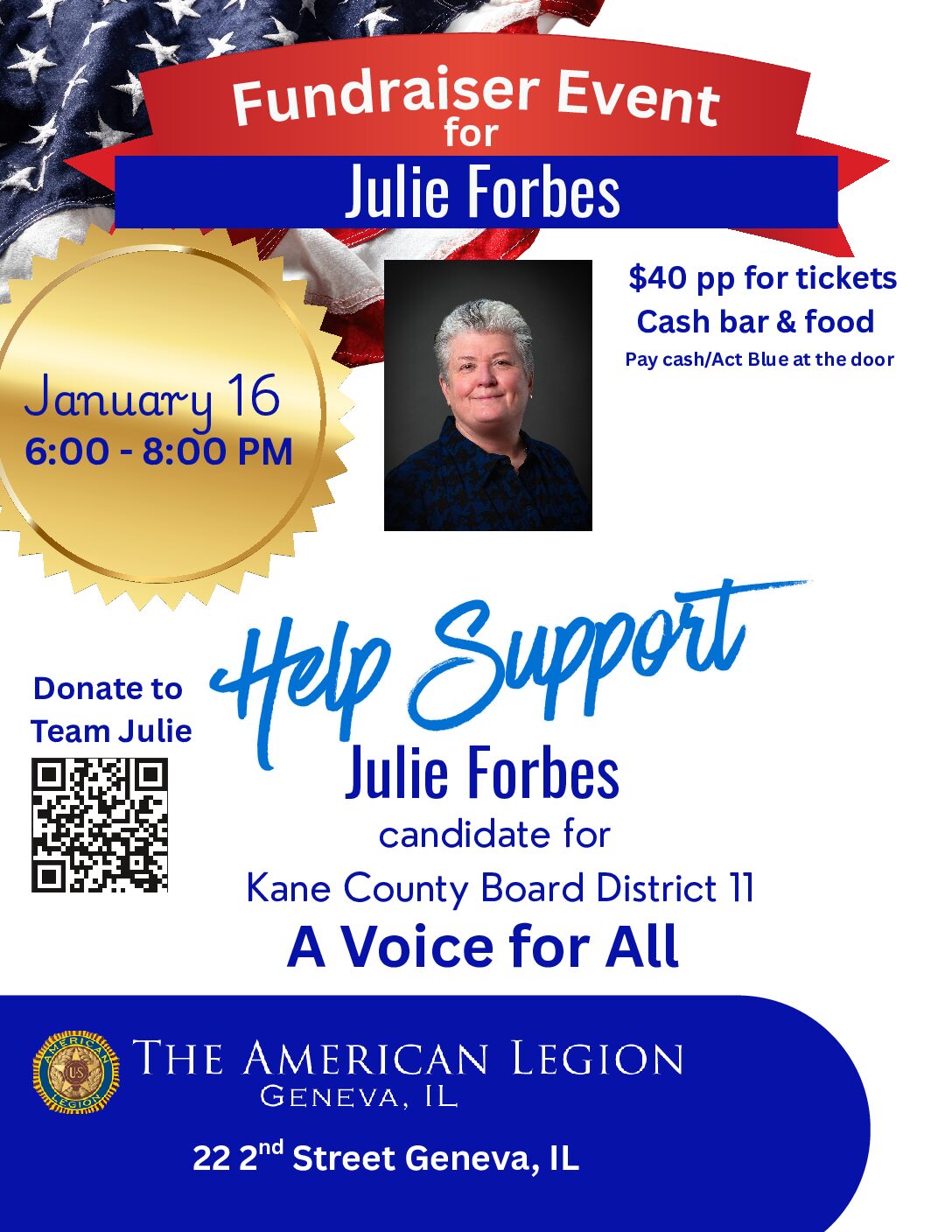 Community • Service • Gratitude Join us for a fundraiser for Julie Forbes, candidate for Kane County Board District 11, at the American Legion Hall Post 75 in Geneva. "I chose the American Legion Hall because it represents service, sacrifice, and coming together for our community." This is a chance to gather with neighbors, to ... Read more