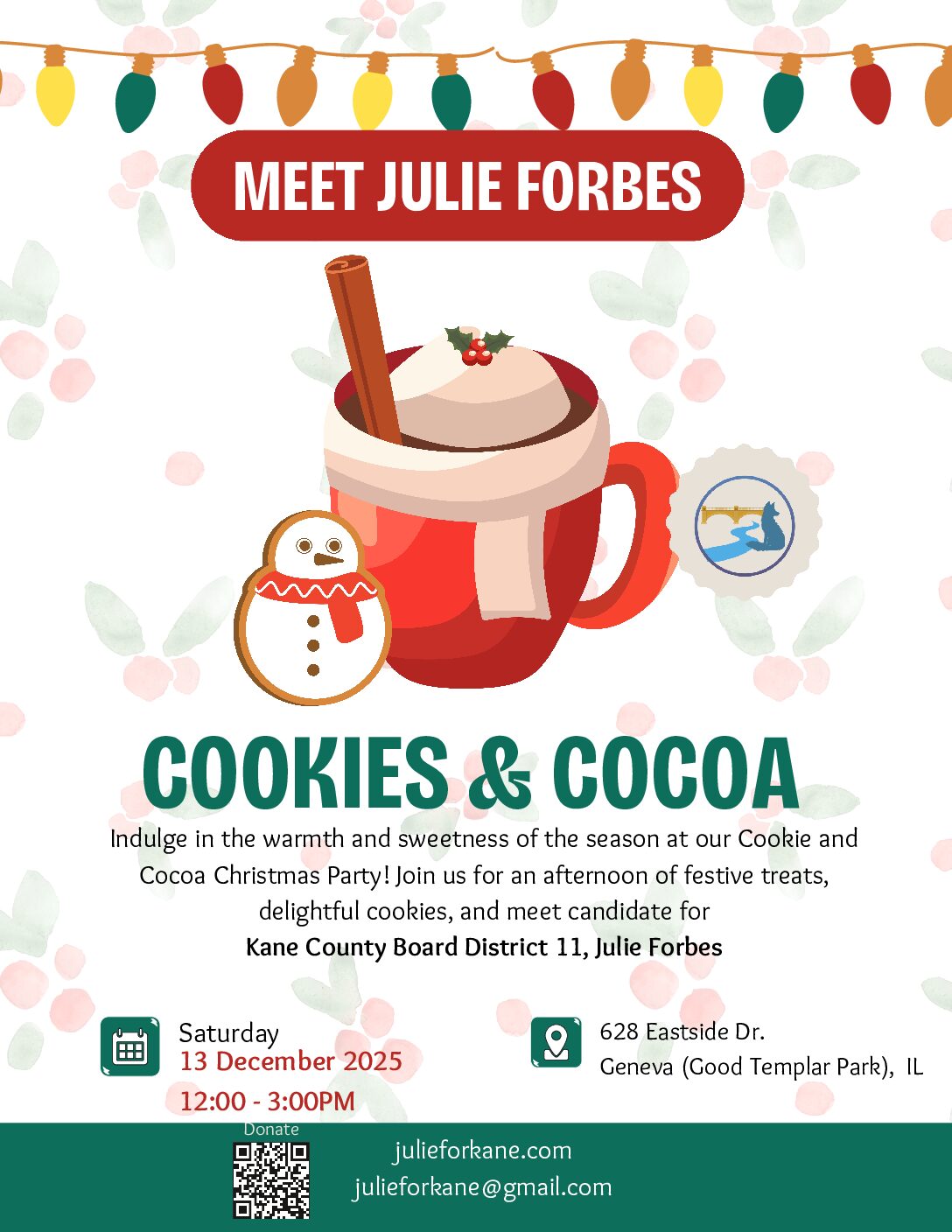Join Julie Forbes, candidate for Kane County Board 11, for a cozy holiday afternoon at Good Templar Park's Tiny Houses - one of Geneva's most chamring winter traditions. Bring the whole famiy and step into a scene that feels straight out of storybook. Warm up with hot cocoa, enjoy the delicious cookies, and meet Julie ... Read more